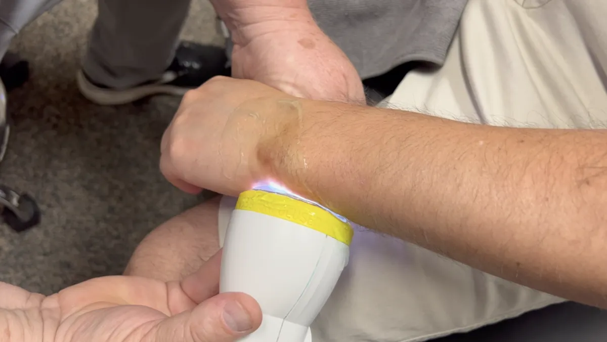 Trauma to the tendons can generate calcified fibroblasts in the injured area. Calcified fibroblasts cause chronic pain which decreases mobility. Using acoustic wave pulses, calcification is cleared from the damaged area after being broken into small particles that are easily absorbed by the body. This reduces pain and restores function.
